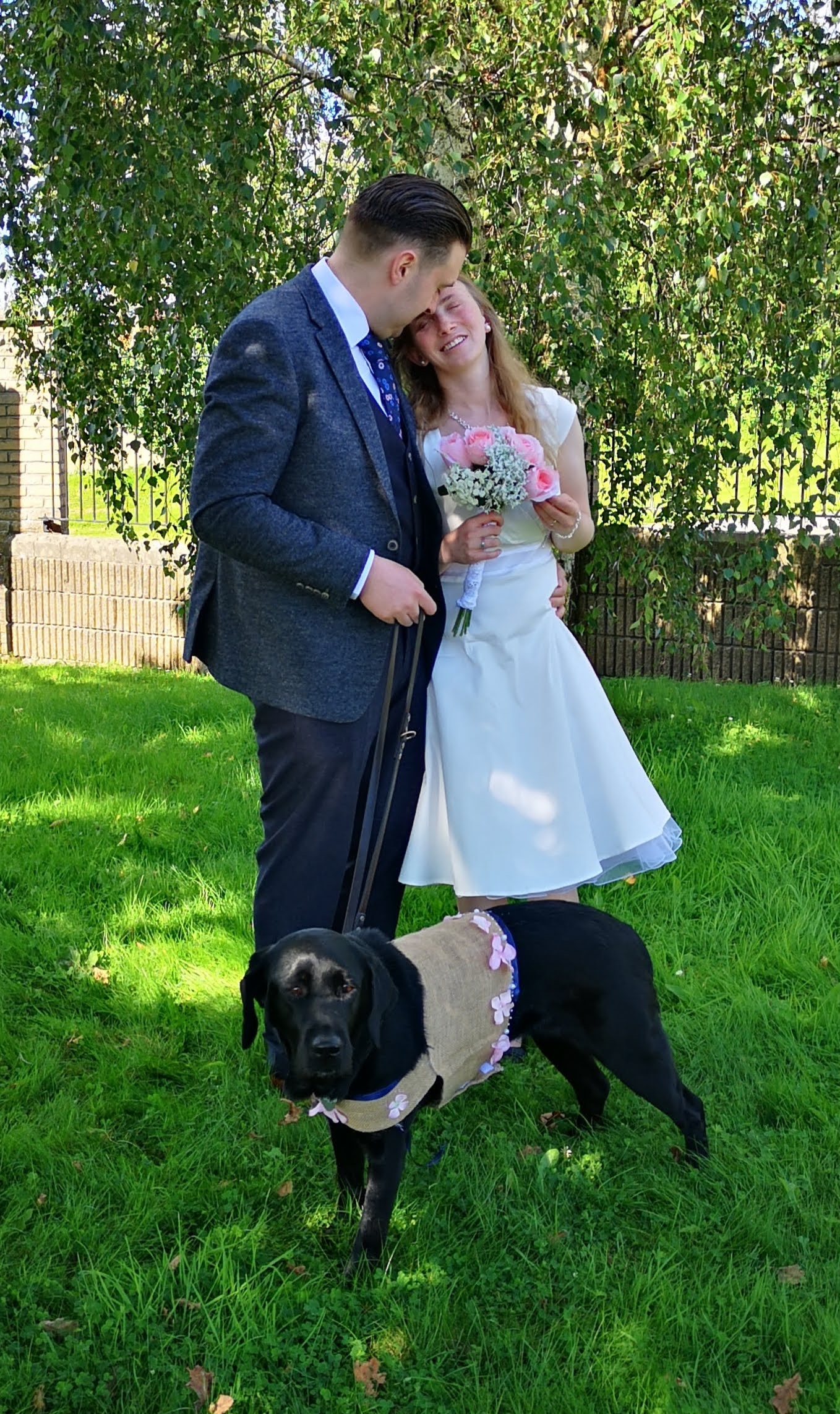 My husband and I on our wedding day with black lab Prim. I am wearing a fifties style white, cap-sleeve dress with sweetheart neckline and puffy skirt. My husband is in his navy suit. Prim is wearing a burlap vest trimmed with blue ribbon, strings of pearls, and pink flowers.